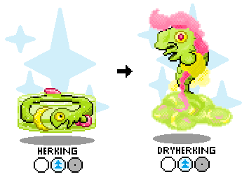 Interesting Facts: Herking jellies its excreted mucus into a puck, protecting against the cold and allowing them to greasily slide across the ice. They’re fishy, but they never swim since their fins are mostly encased in their guzz. Dryherking really pumps up the jam, replacing the mucus with various colorful stink fumes it swim-flies through. Nothing’s stinker than a Dryherking, but hey, don’t take my word for it, take your nose’s.