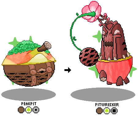 Interesting Facts: Peakpit is mostly a lump and rarely moves, leading it to accumulate dirt and flora. Once integrated into its environment it releases a tantalizing peach smell from its fleshy cap, driving people wild when they can’t find any peach trees. As Pitwrecker they waddle around demolishing mountainsides, making good divots for Peakpits to bury themselves in.