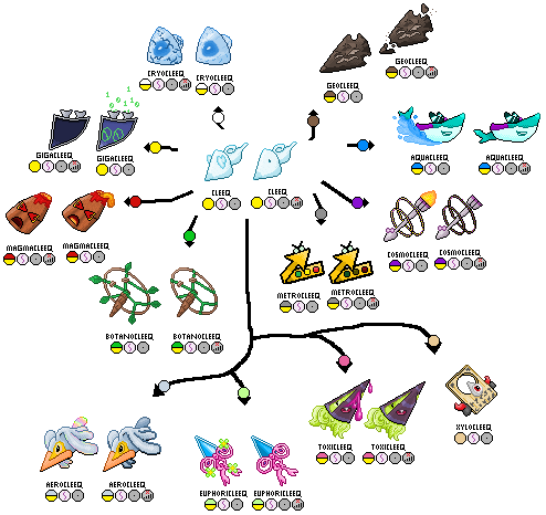 Cleeq, Aquacleeq, Cosmocleeq, Metrocleeq, Botanocleeq, Magmacleeq, Gigacleeq, Cryocleeq, Geocleeq, Aerocleeq, Euphoricleeq, Toxicleeq, & Xylocleeq