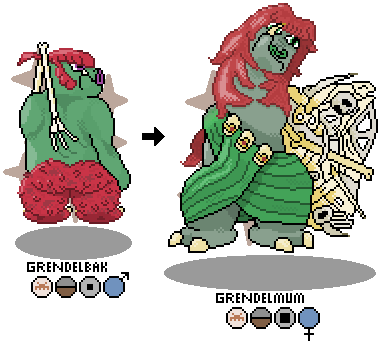 Interesting Facts: Grendelbak is a lazy ruffian that always tries to sleep inside, whether it’s invited or not. One of its arms is withered down to bone so it can be used as a much more effective back scratcher. All Grendelbaks are male, but they change into females when they mature. Grendelmum sheds bones from its arms to build a shield, adding any other bones it finds. The arm that doesn’t wield the shield is completely empty of bone, so they wrap it around their body like a dress.