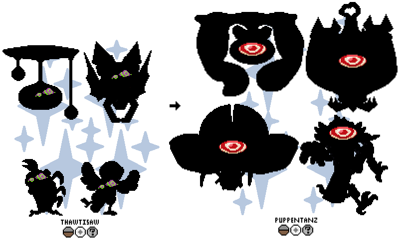 Interesting Facts: Thawtisaw hides in the shadows of other cillimorphs, but can break away when frightened and make off with their silhouette. It can borrow a wide variety of shadows, but when it matures it will mature into the silhouette of its currently borrowed shadow’s adult form. If you look closely, you can see the tendrils Puppentanz uses to control a shadow, which they can march right into daylight much more effectively than their juvenile stage can.