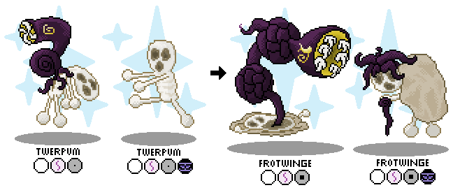 Interesting Facts: Many a traveler has been thoroughly spooked by wandering haunted figures of flesh in the whipping snow of Brrr, but they’re just the disguising mantles of Twerpum and Frotwinge, who keep warm inside their grotesque cloaks. Frotwinge further generates balls of sustained heat by knotting itself.