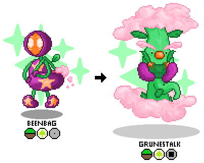 Interesting Facts: Beenbag forages for whimsical residue of silliness fields, cultivating them inside its bag until they ferment to a cloud-like consistency. Grunestalk hides its incredible height inside these gathered materials, creating an endless portal between floating clouds.