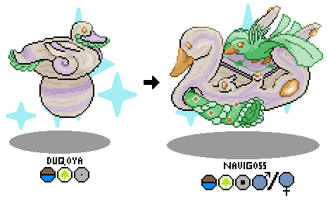 Interesting Facts: Buoyed by a hollow sphere of wood, Duqoya hangs out with waterfowlish morphs despite its awkward silence. Maturing into Navigoss splits it into two parts: a home base female and a flying male adapted to maximize reproductive opportunities.