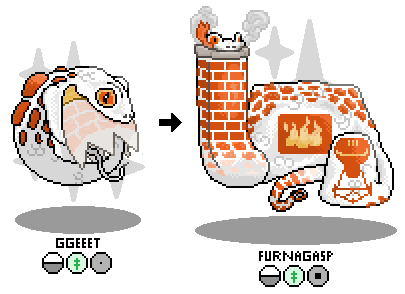Interesting Facts: Ggeeet both remains in its eggshell and endlessly bites its base, using the shape to roll everywhere. Furnagasp unhinges its jaw and swallows any sources of heat it can to cope with its cold environment, often human things like fireplaces and grills that wind up shown on its external patterns.