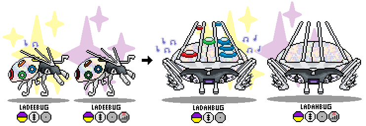 Interesting Facts: Gathering both data and cosmic rays, Ladeebug uses them as inspiration to make music whereas Ladahbug compacts them into discs delivered rhythmically to the mouth along the antennae-rack, cutting out the middleman of artistic intent to just have a snack as nourishment instead.