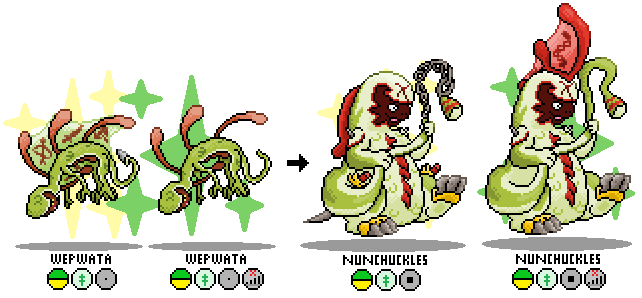 Interesting Facts: Wepwata has a customizable tail that can shape into different weapons, with all of the choices displayed on the folds of its body-encompassing sail. Nunchuckles can use several at once, but sometimes has to sneak an awkward stretched look at its own body to keep track of them all.